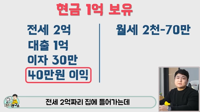 예를 들어 신혼부부가 현금 1억을 가지고 신혼집을 구할 때 소형 평수 아파트가 하나는 전세2억이고 하나는 월세로 보증금 2천에 월70일 경우 보통의 경우는 전세대출 1억을 받아서 전세 2억짜리 집에 들어가는데요.
