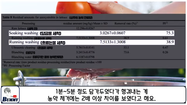 그리고 흐르는 물에 씻어야 농약이 잘 제거 될 거라고 생각하지만 농약은 물에 용출되어 나오는 시간이 필요하기 때문에 흐르는 물에 바로 씻는 것보다 1~5분 정도 담가두었다가 행궈내는게 농약 제거에는 2배 이상 차이를 보였다고 합니다.