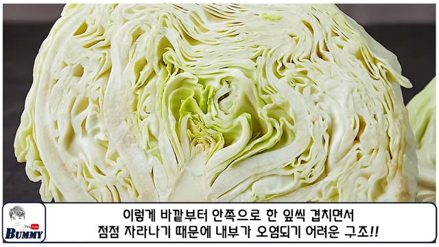 양배추는 안쪽에서 바깥으로 잎이 자라나는게 아닌 바깥에서 안쪽으로 한 잎씩 겹치면서 점점 자라나기 때문에 내부가 오염되기 어려운 구조라고 합니다.