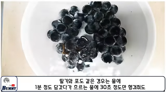 딸기와 포도 같은 경우는 물에 1분 정도 담갔다가 흐르는 물에 30초 정도만 헹궈줘도 잔류 농약을 제거하는데 효과적이라고 합니다.