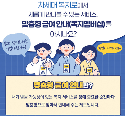 복지 멤버쉽 제도란 나에게 해당되는 복지제도를 자동으로 안내를 받아볼 수 있는 서비스로 한 번 신청만 하면 알아서 문자와 이메일로 안내를 해주기 때문에 자신이 직접 찾아가는 번거로움을 줄일 수 있습니다.
