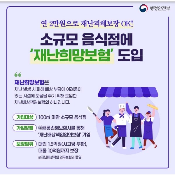 재난배상책임보험은 현재 100제곱 미터 이상의 시설은 의무 가입이 되어있지만 100제곱 미터 미만의 소규모 음식점은 재난배상책임보험 의무 가입에 제외되어 있기 때문에 화재 발생 시 피해 배상 부담에 어려움이 있습니다. 연간 2만원으로 가입이 가능하기 때문에 꼭 가입을 하시길 바랍니다.