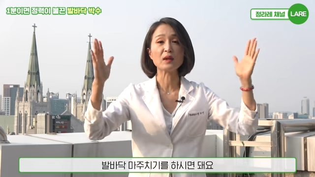 이럴 경우에는 약식으로 할 수 있는 방법이 있는데 다리를 들어올리는 것이 아닌 다리를 바닥에 둔 상태로 같은 방법으로 발바닥을 마주 보게 한 후에 양쪽 용천형을 자극하면서 박수를 쳐 주시면 됩니다.
