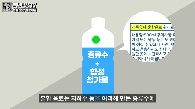 반면 대부분의 생수 판매 코너에서 판매 중인 제품은 먹는 샘물이지만 혼합 음료 제품도 섞여 있습니다. 혼합 음료는 지하수 등을 여과해 만든 증류수에 다양한 합성첨가물을 넣은 음료의 일종입니다.