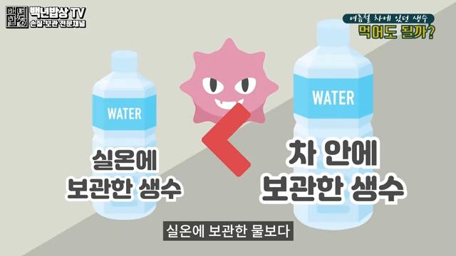여름철 생수를 차안에 두게 되면 차 내부 온도가 높아지면서 세균이 번식하기 좋은 환경이 되고 실온에 보관한 물보다 세균이 7배나 많이 발견되었다는 연구결과가 있음으로 절대 드시면 안 됩니다.