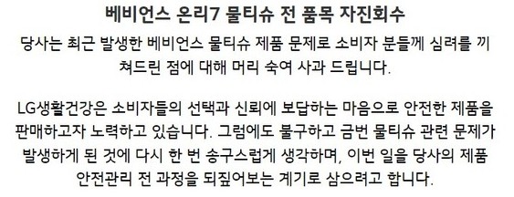 여러가지로 문제가 많아 보이는데 결국 LG생활건강 측은 해당 제품에 대한 논란이 지속되자 물티슈 사업을 철수하는 결단까지 내리게 되었다고 합니다.