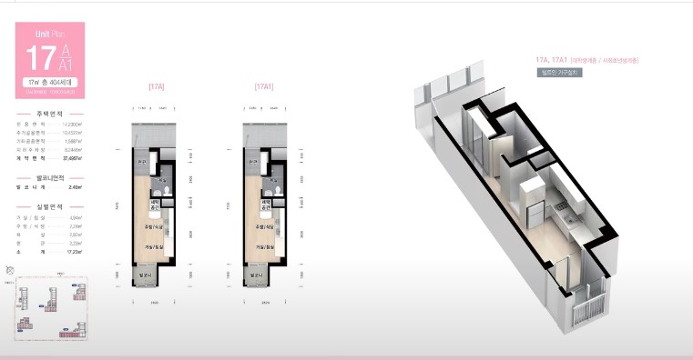공급 면적은 17형 단일면적이며 냉장고, 세탁기, 책상 등 풀옵션 아파트입니다.