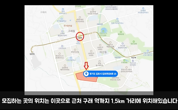 모집하는 곳의 위치는 구래 역 까지 1.5km 거리에 위치하고 있으며 서울과 접근성이 좋아 교통이 편리하고 한강의 쾌적한 환경까지 느끼실 수 있습니다.