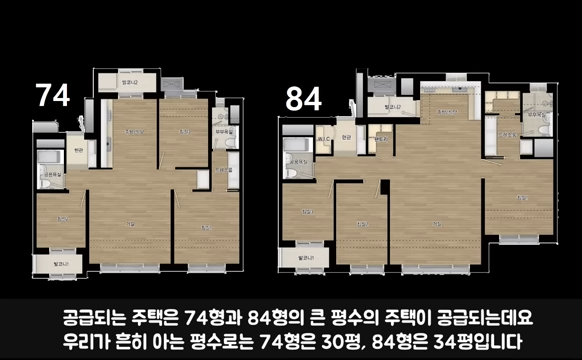 공급되는 주택은 74형과, 84형의 큰 평수의 주택이 공급되는데요. 평수로는 74형은 30평, 84형은 34평입니다.