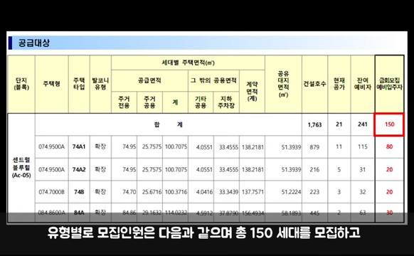 유형별로 모집인원은 다음과 같으며 총 150세대를 모집하고 모든 유형이 발코니 확장공사를 통하여 평수에 비해 넓은 공간이 공급됩니다.