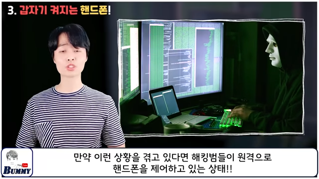 화면이 마음대로 켜지거나 이상한 소리 또는 배터리가 있는데도 불구하고 수시로 재부팅이 된다면 현재 해킹범에게 원격 제어를 당하고 있을 확률이 크다고 합니다.