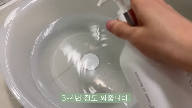 그 뒤에 따듯한 물을 부은 대야에 샴푸를 3-4번 정도 짜주고 잘 저어서 거품을 만들어 주세요.