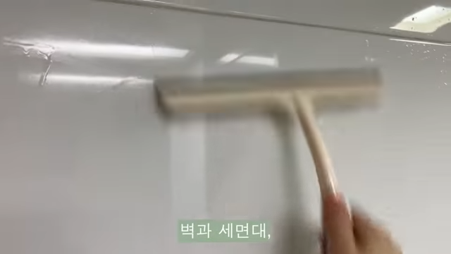 스퀴즈를 통해 벽과 거울 세면대 그리고 바닥까지 물기를 제거해 주세요. 수전은 마른 걸레를 활용하여 닦아주시면 됩니다.