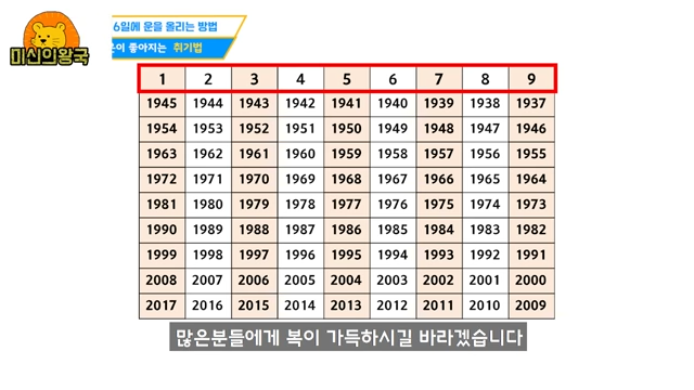 이미지를 보시면 태어난 년도를 기반으로 위에 본명성이 있습니다. 본명성은 숫자 1~9까지 있는데 태어난 년도를 기반으로 만들었기 때문에 이것을 참고하시고 본인에게 도움되는 방향으로 이동을 하셔서 좋은 기운을 많이 받아오시길 바라겠습니다.