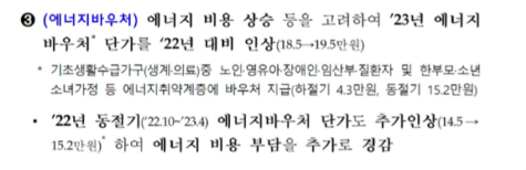 에너지 바우처도 변경 내용이 있습니다. 지난 해까지는 에너지 바우처가 18만 5천원이었는데요. 이것을 올해 19만 5천원까지 인상시켜 준다고 합니다. 올해 4월까지 적용되는 22년 동절기 에너지 바우처 단가 역시 14만 5천원에서, 15만 2천원으로 추가 인상해 드립니다.